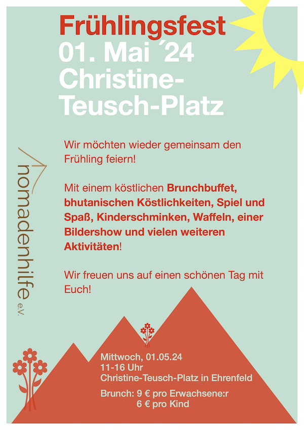 Das Fest findet am 01.05.2023 von 11 - 16 Uhr auf dem Christine-Teusch-Platz in Köln-Neuehrenfeld statt. Euch erwarten ein großes Frühlingsbrunch-Buffet mit Speisen aus aller Welt, Waffeln, Kaffee & Kuchen, Spiele & Bastelspaß für Kinder, Workshops und vieles mehr! In diesem Jahr ist auch ein Teil unseres Teams aus Bhutan vor Ort und kann euch über laufende Projekte und neue Ideen informieren.