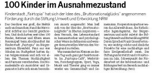 An vielen Orten Deutschlands können Kinder an Kinderstädten teilnehmen. Dabei wird für den Zeitraum von meist einer Woche das typische Leben erwachsener Menschen kreativ nachempfunden. Die Ehrenfelder Kinderstadt zielt jedoch mehr auf eine nachhaltige und gerechte Lebensweise ab. Hier wird versucht, mit den Kindern eine Gesellschaft zu gestalten, die nicht an erster Stelle auf die Anhäufung von Geld und Konsum ausgerichtet ist. Stattdessen stehen Themen wie Glück, Umweltschutz, CO2-Einsparung, ein sinnvoller Umgang mit Ressourcen, Gerechtigkeit und Gemeinschaft im Vordergrund. Inspiration holen sich die Organisator*innen durch das Bruttonationalglück aus Bhutan.